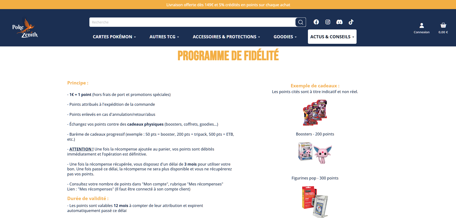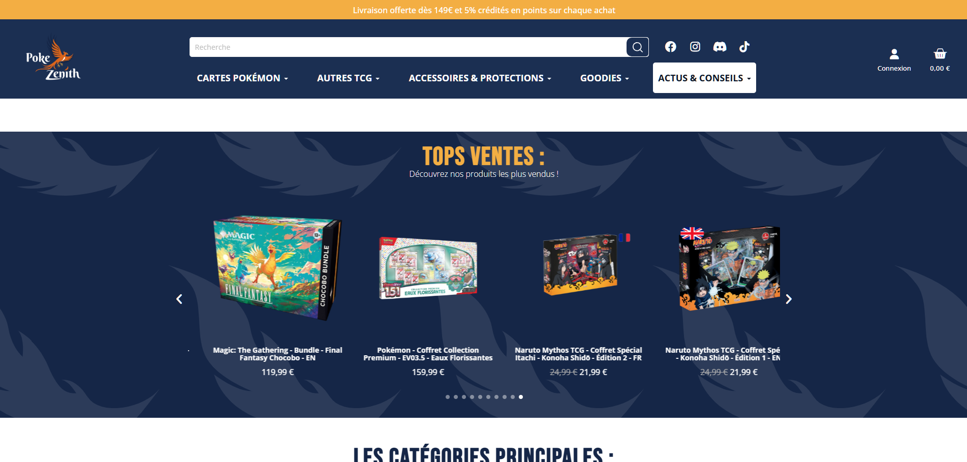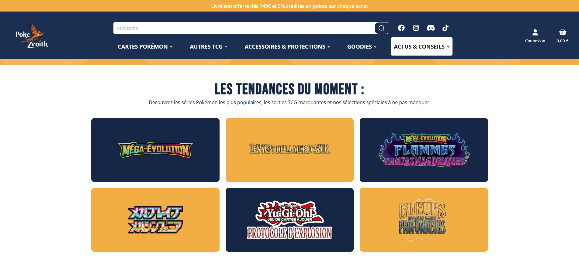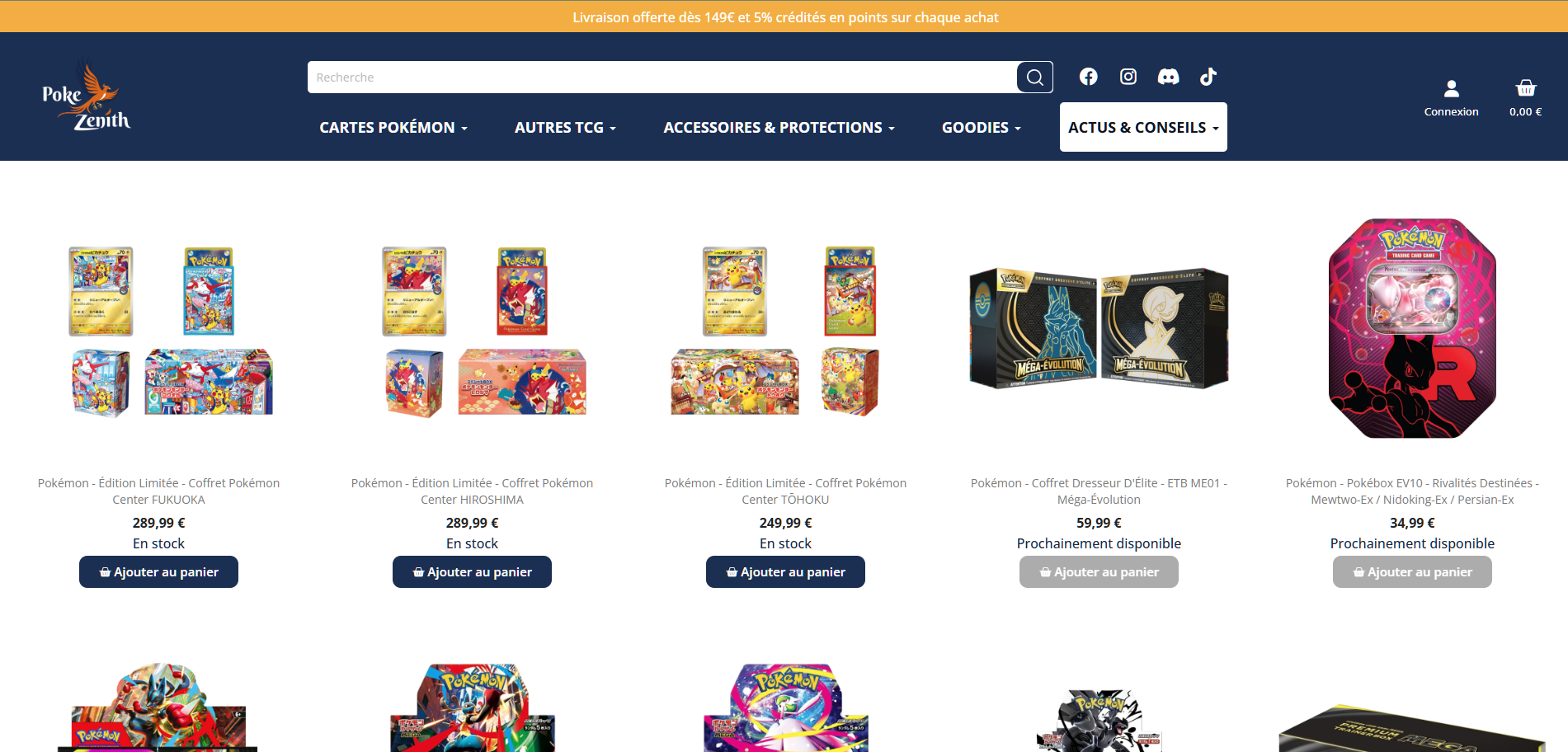PokeZénith s’est imposé comme une référence incontournable pour les passionnés de l’univers Pokémon. Spécialisée dans la vente de cartes à collectionner (TCG), de coffrets rares et d’accessoires de protection, la boutique s’adresse à une communauté exigeante de collectionneurs et de joueurs. Qu’il s’agisse de dénicher les dernières nouveautés japonaises ou de compléter des séries iconiques, PokeZénith mise sur l’authenticité des produits et la passion du partage pour offrir aux dresseurs de tous horizons un catalogue riche et constamment renouvelé.